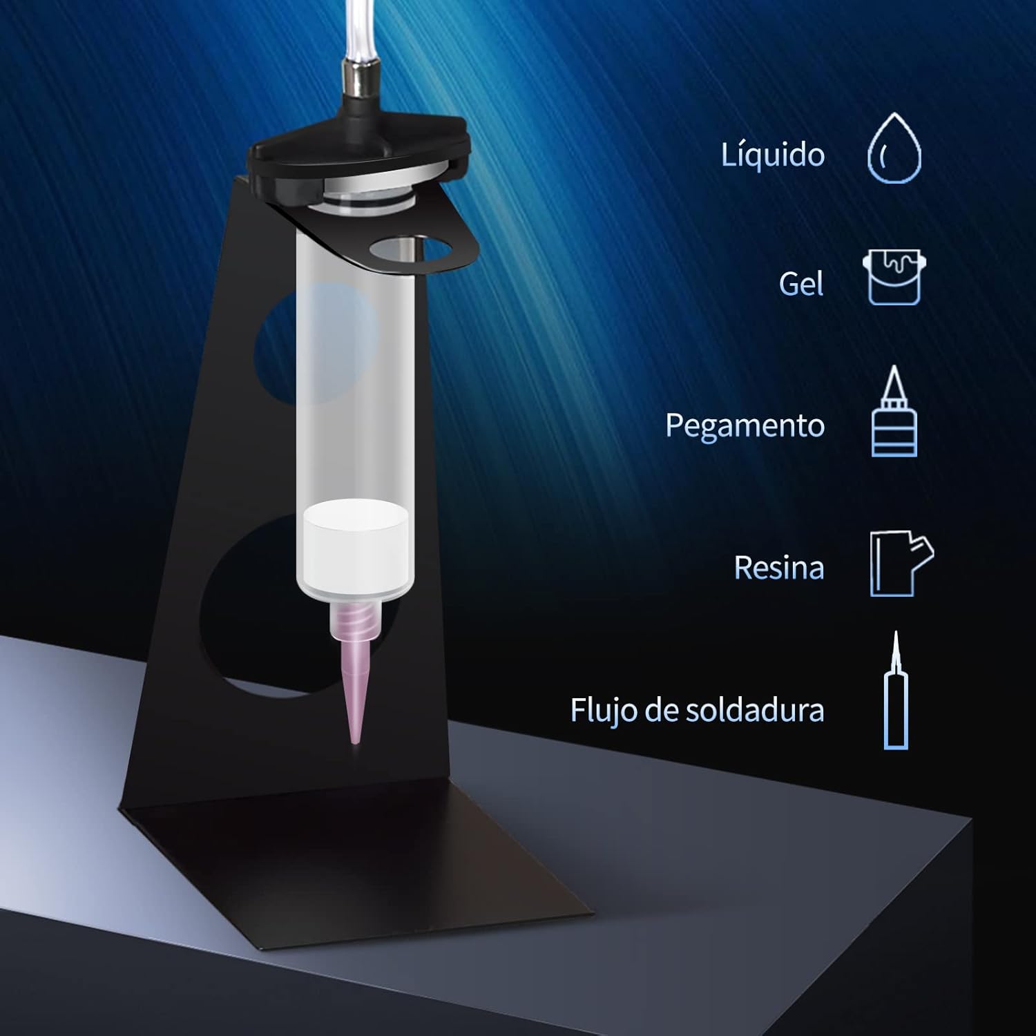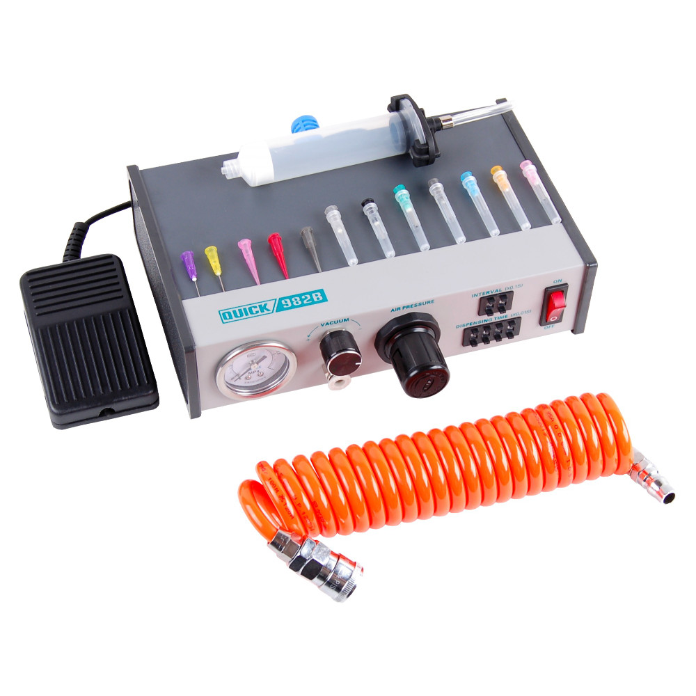 El dispensador automático QUICK 982B proporciona una dosificación precisa y regular de diversos tipos de geles, pastas, pegamentos, geles de sílice, etc. Dispone de interruptor de pedal y modos de control manual. El juego incluye varios tipos de boquillas.