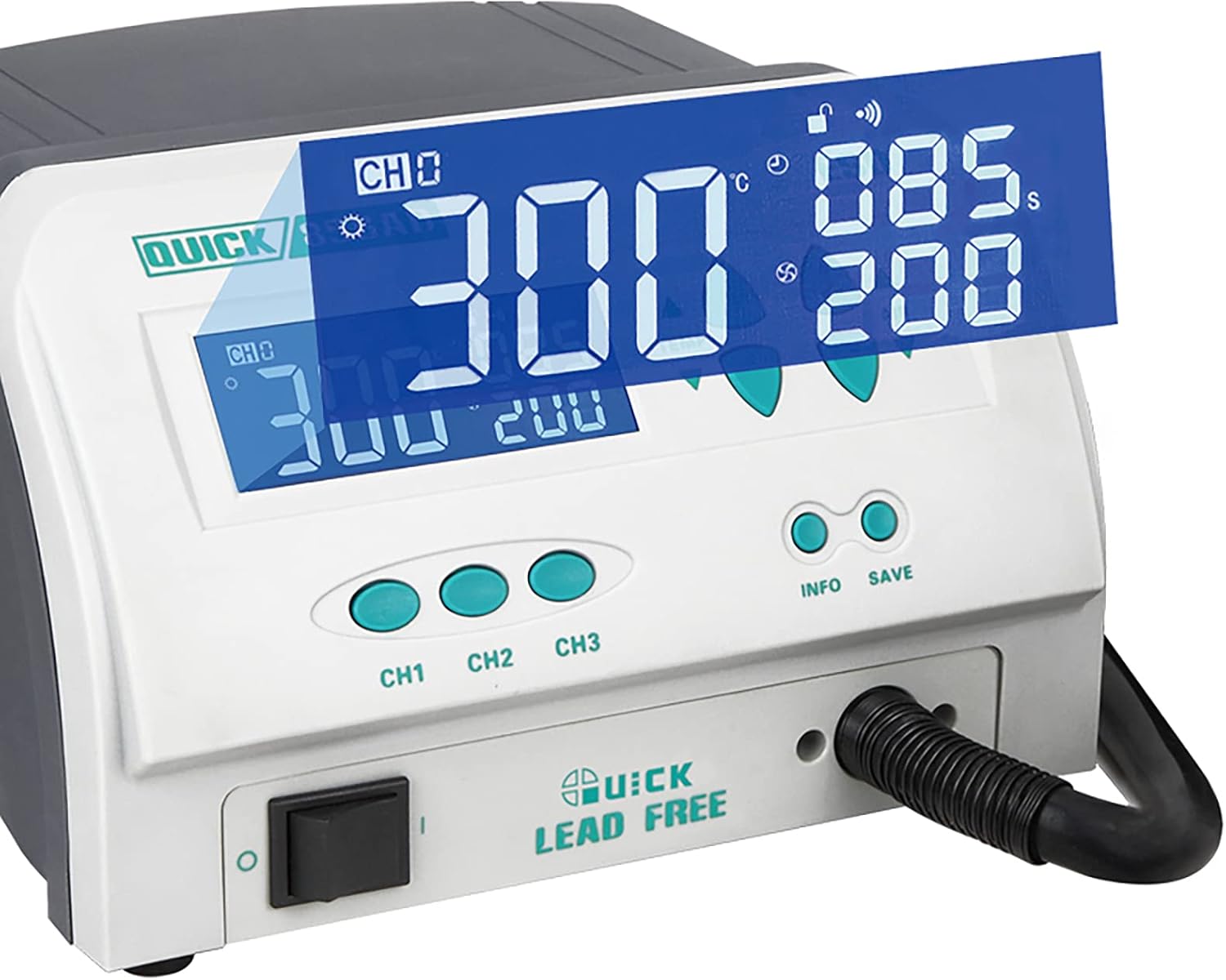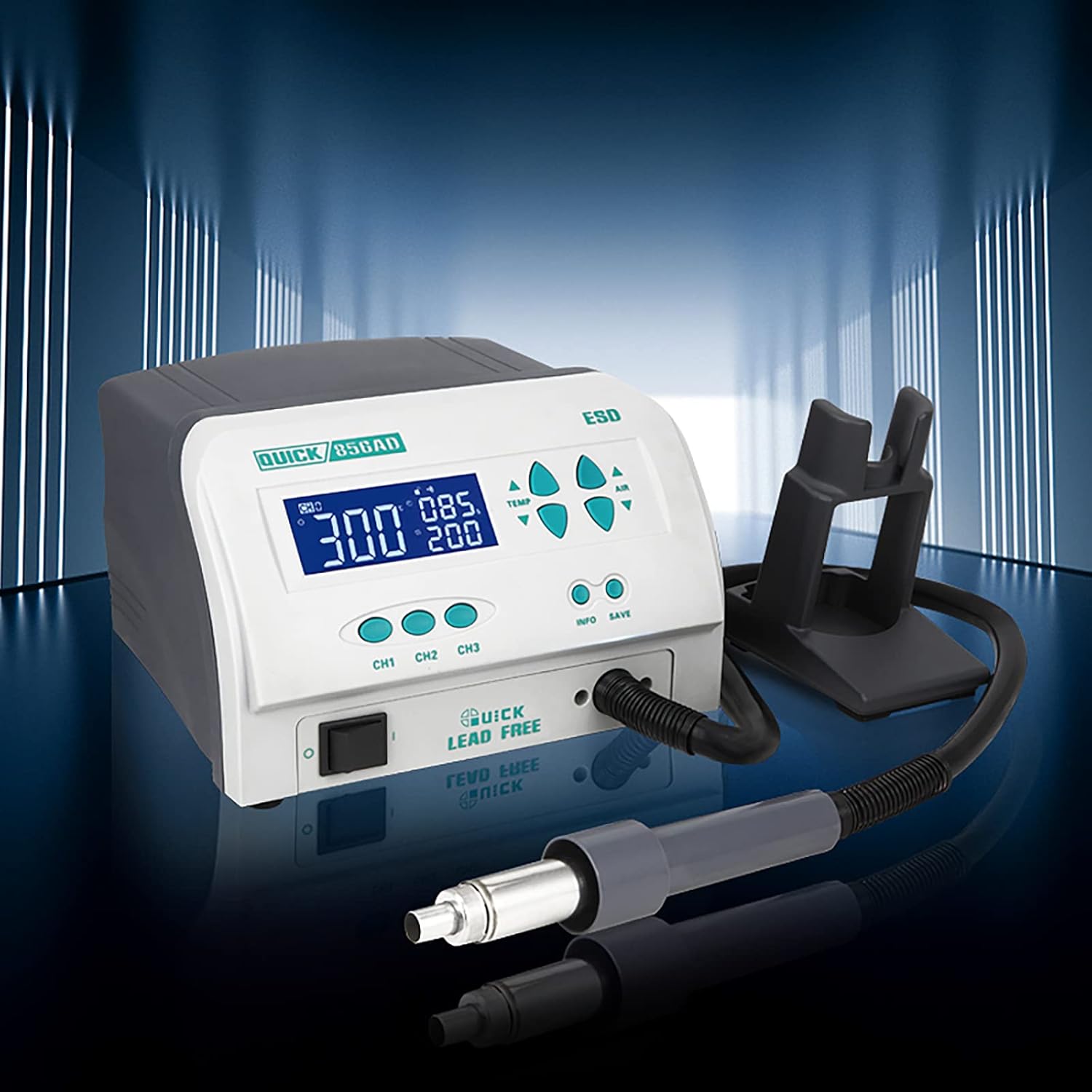 Estación de aire caliente sin plomo Quick 856AE con 1300W de potencia, ideal para soldadura y retrabajo electrónico preciso y eficiente.