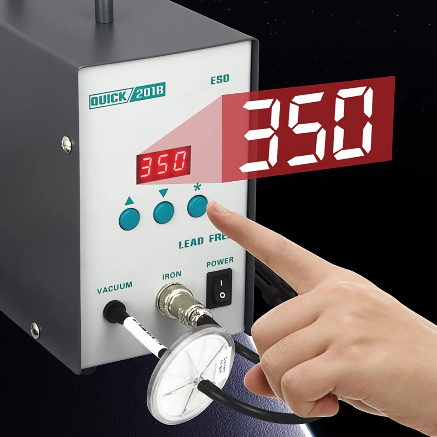 QUICK 201B ESD Estación de desoldado al vacío con una potencia calorífica de 90 W. Rango de temperatura: 200 °C a 450 °C.
