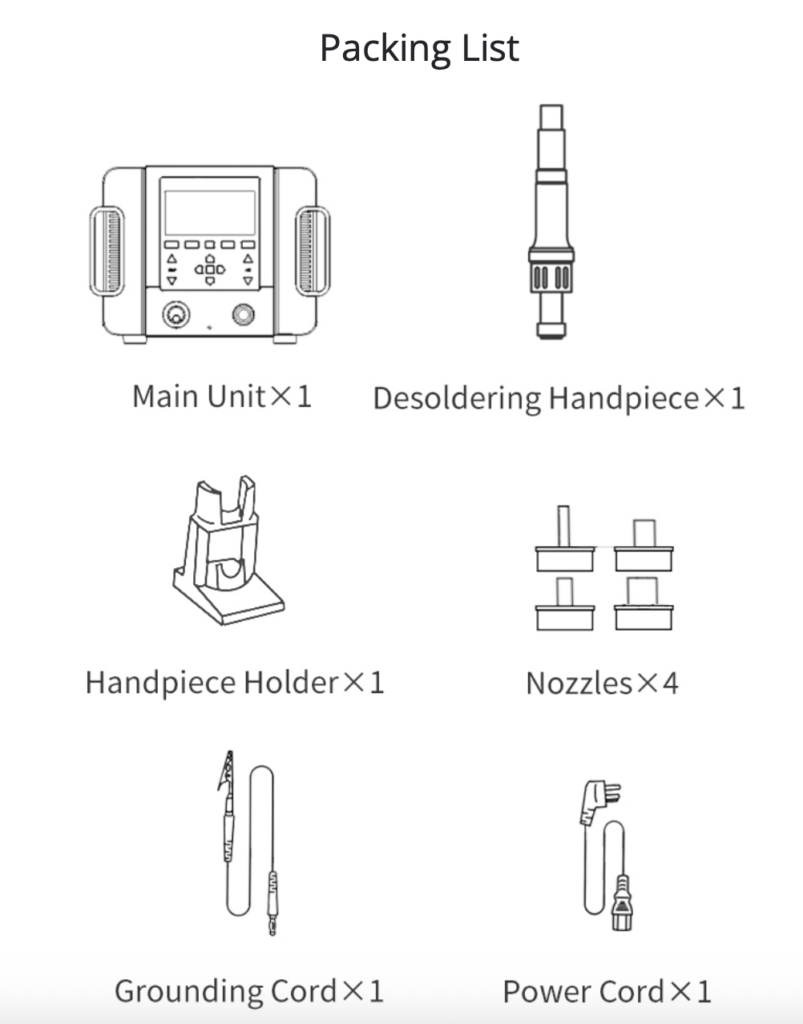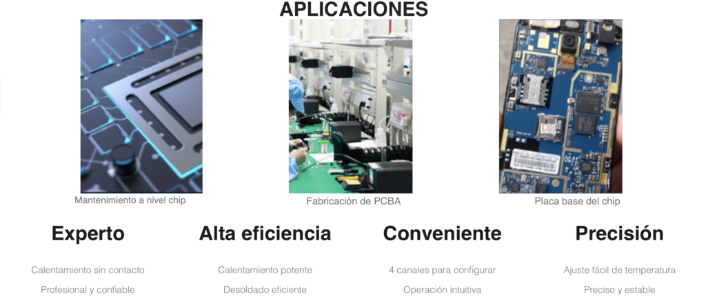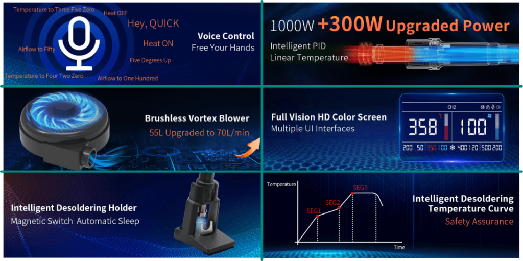 Estación profesional de retrabajo, aire caliente con una potencia de 1300 W. Con un sistema inteligente que ajusta la temperatura desde 50 °C hasta 550 °C.
