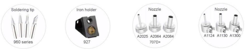 - Diseño totalmente metálico del calentador: duradero, de bajo voltaje, seguro; diseño independiente del calentador y la punta de soldadura, lo que reduce el coste de los consumibles.