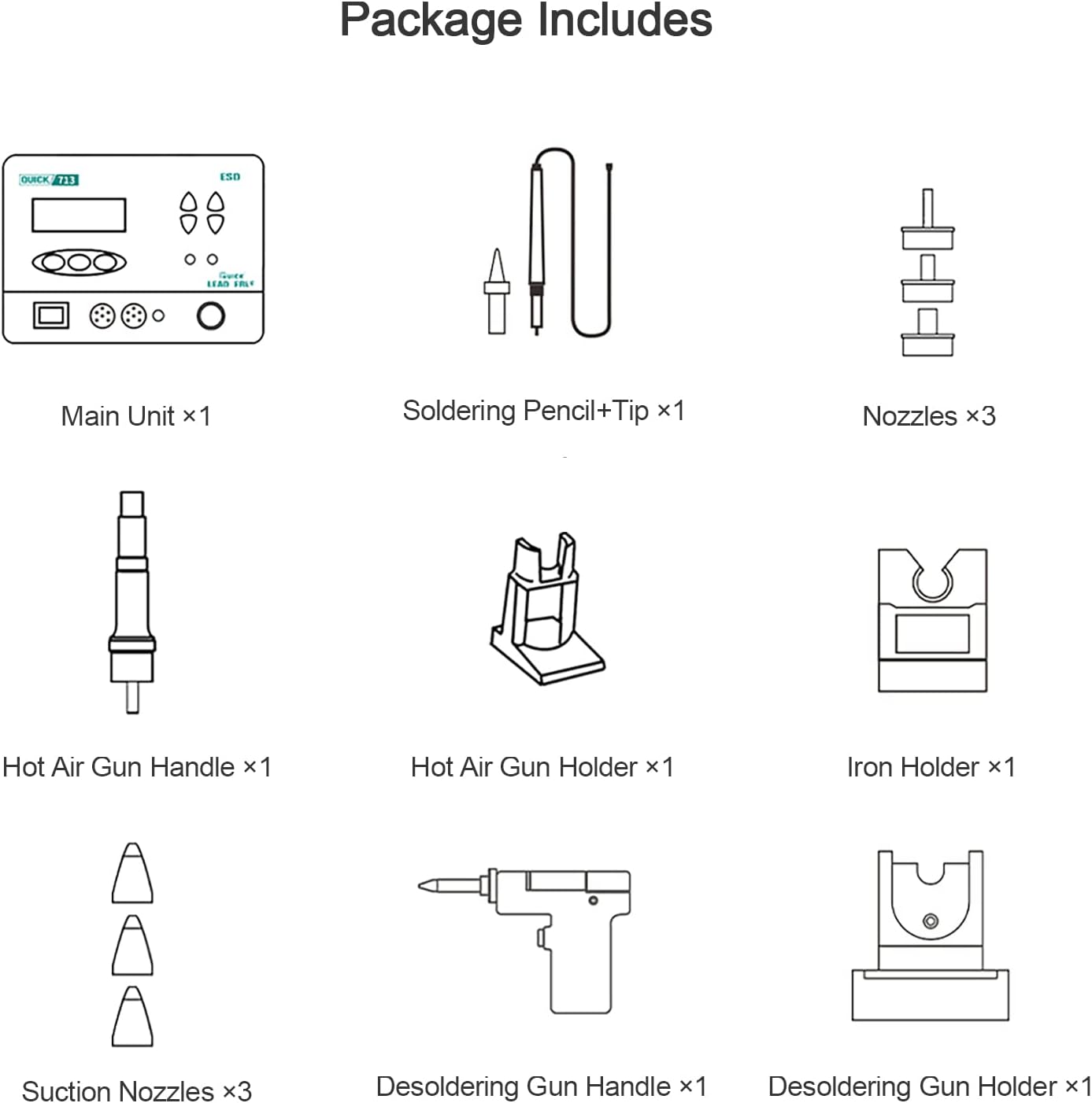 Estación Retrabajo Quick 713 | soldador 90W + AIRE CALIENTE 1000W + desoldador 90W