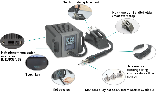 - Adecuado para retrabajar diversos componentes, como SOIC, CHIP, QFP, SOP, PLCC, SOJ, BGA y QFN.