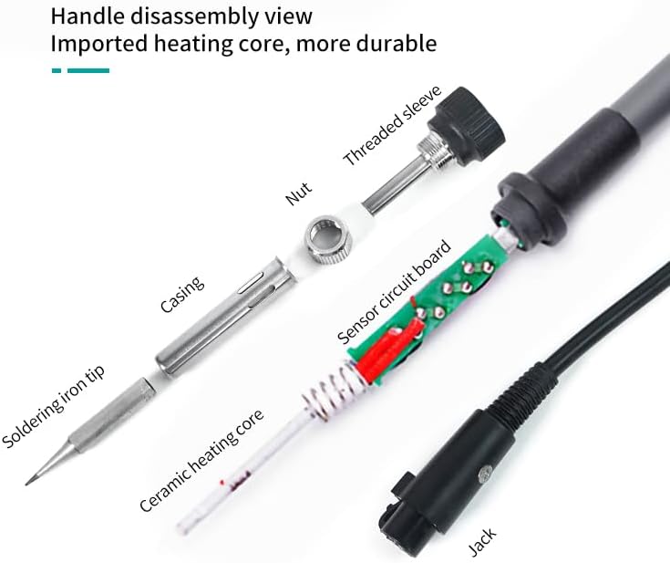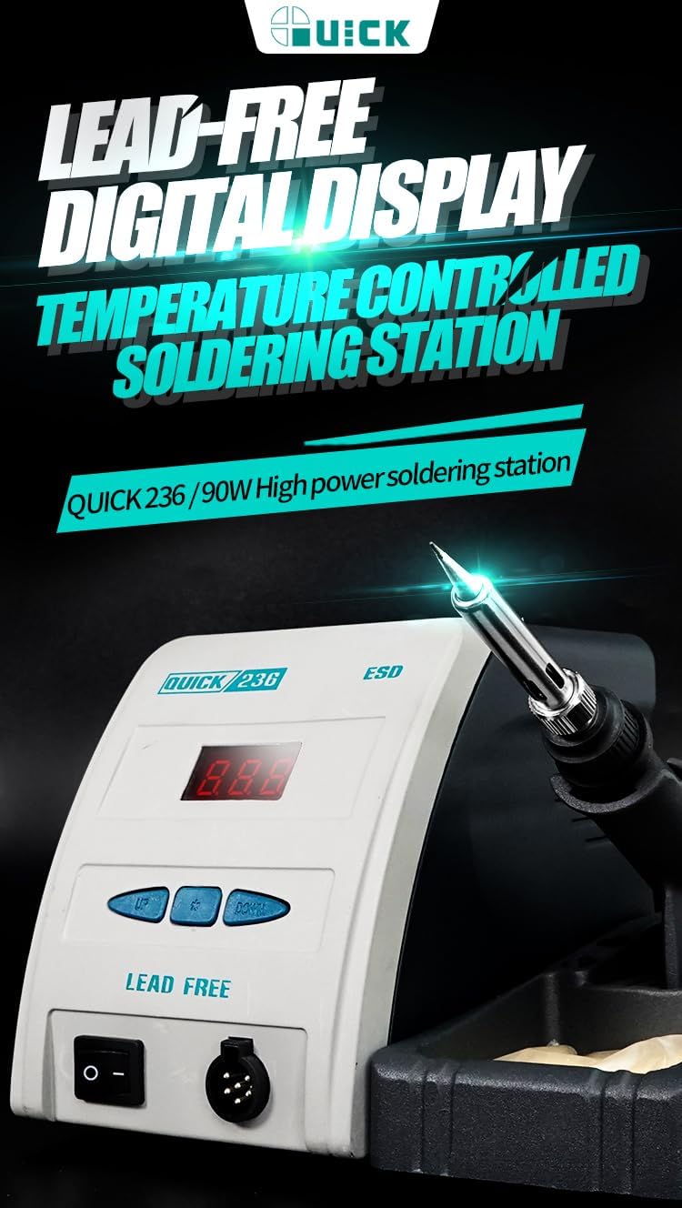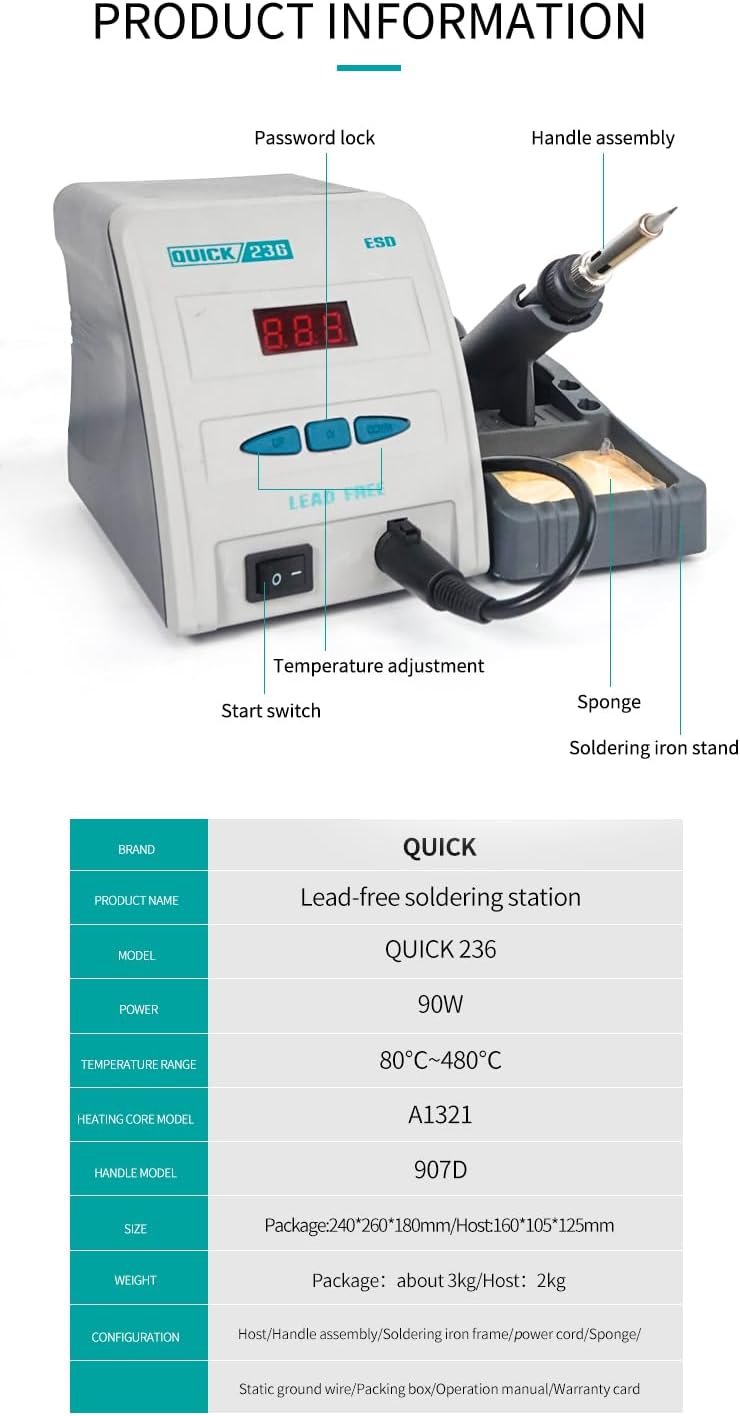 Estación de soldadura sin plomo potente y segura contra descargas electrostáticas (90 W) con pantalla LCD digital. Ajuste de temperatura de 80 °C a 480 °C, estabilidad a alta temperatura (±2ºC).