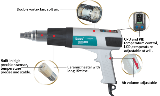 - Bucle cerrado de sensor; temperatura controlada por microordenador con disparo de cero voltaje, precisa y estable, no afectada por el caudal de aire.